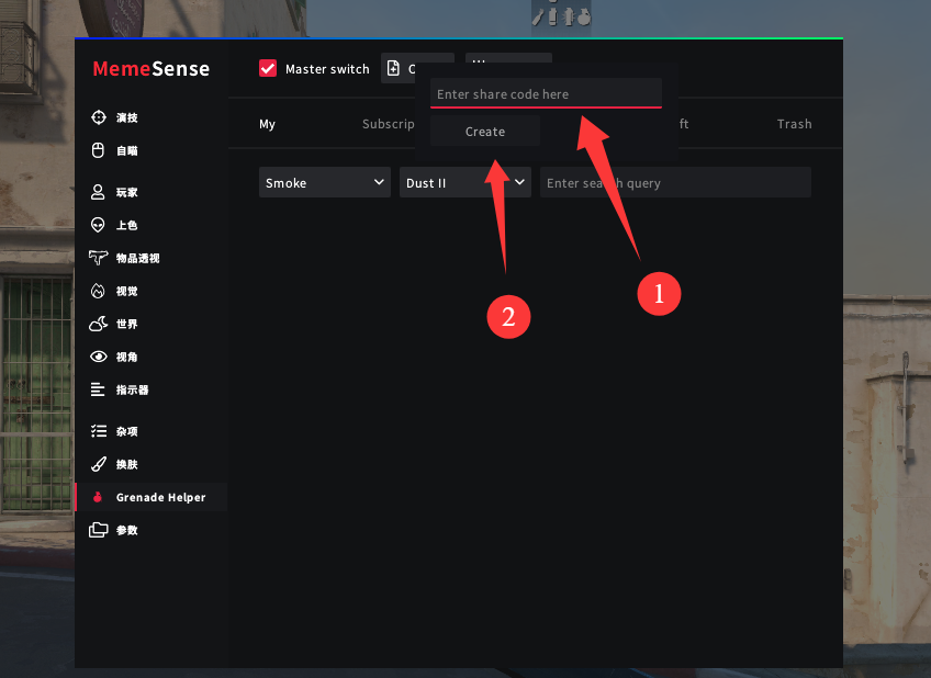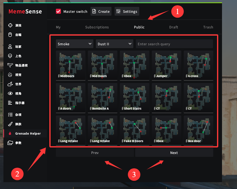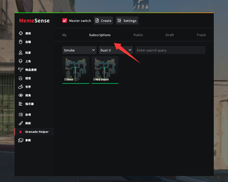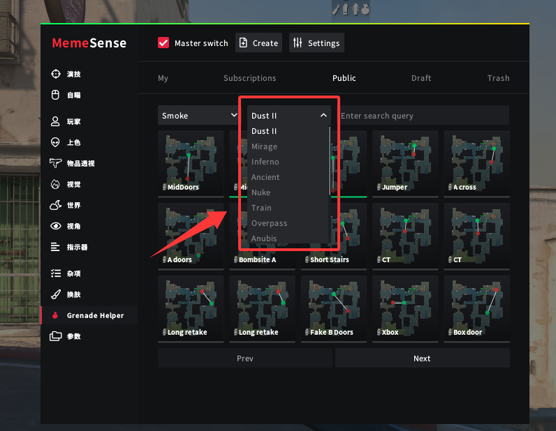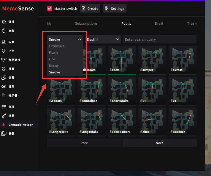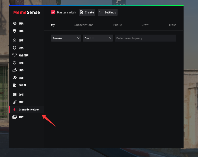 首先我们打开菜单,选择 Grenade Helper (道具助手)。