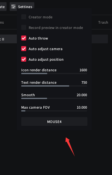 2. Settings:设置开关(投掷平滑度、投掷范围等都在里面调)