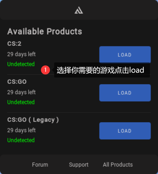 选择需要的游戏 (CS2),然后点击 Load 按钮开始注入。