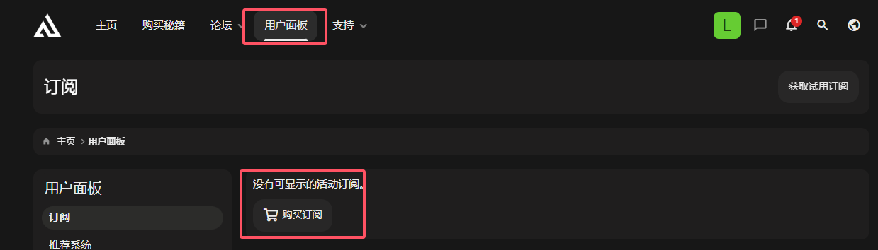 点击导航栏的“用户面板”在点击下面的“购买订阅” 。